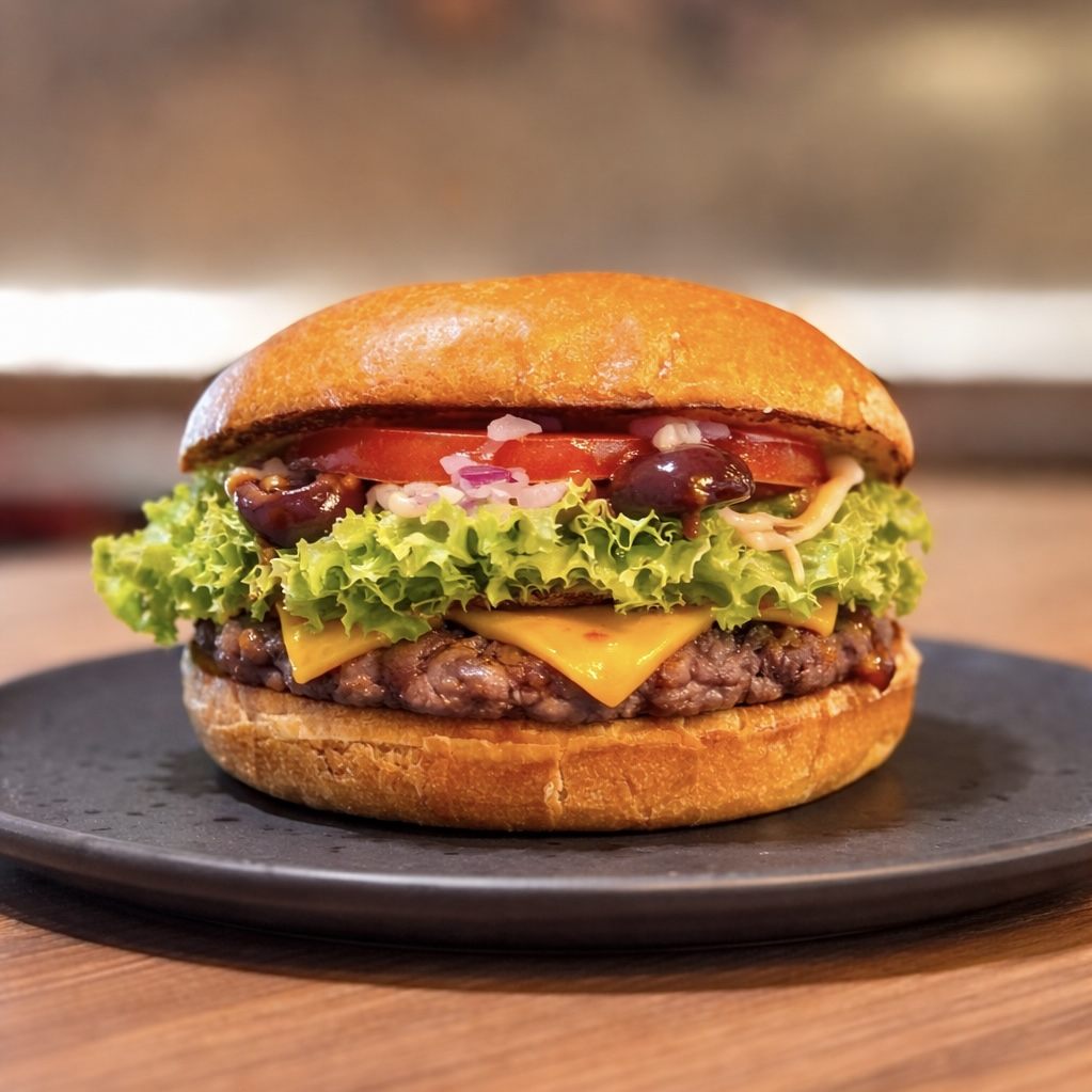 Pão brioche, blend 100g feito na parrilla, queijo cheddar em dobro, alface, tomate, cebola roxa picadinha, azeitonas pretas, barbecue e maionese.